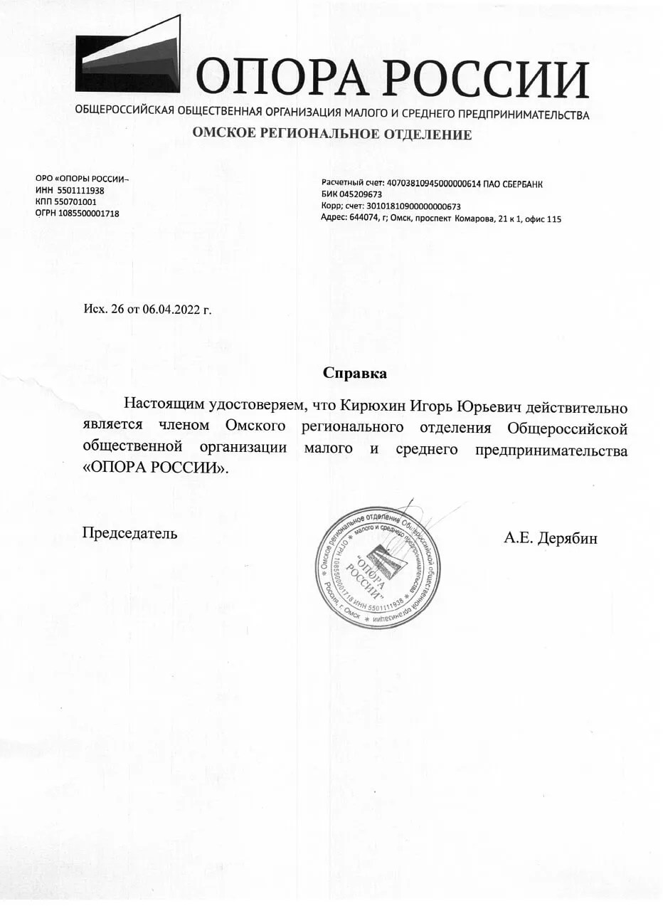 Членство в общественной организации "ОПОРА РОССИИ"
