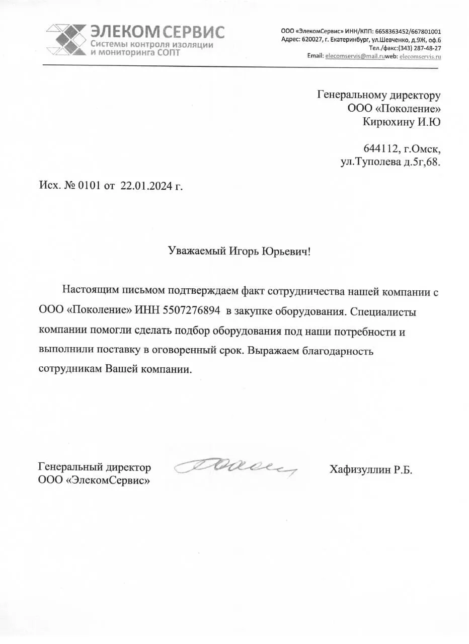Благодарственное письмо ООО "ЭлекомСервис"