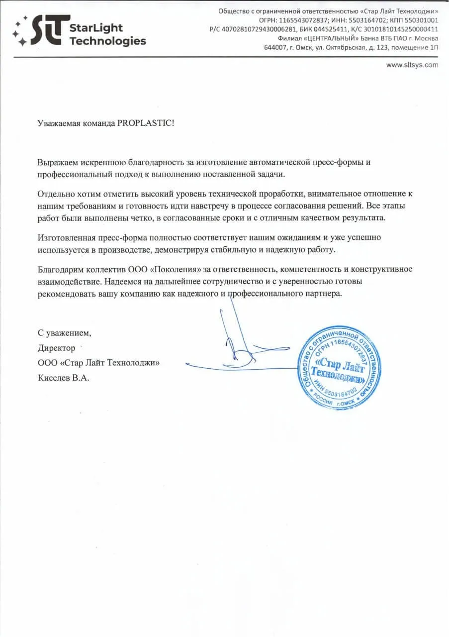 Благодарственное письмо ООО "Стар Лайт Технолоджи"