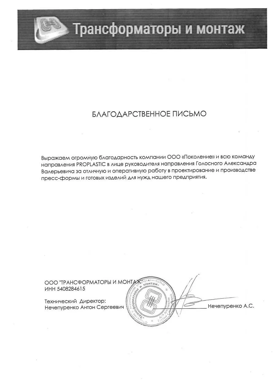 Благодарственное письмо ООО "ТРАНСФОРМАТОРЫ И МОНТАЖ"