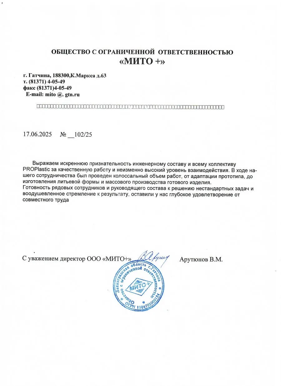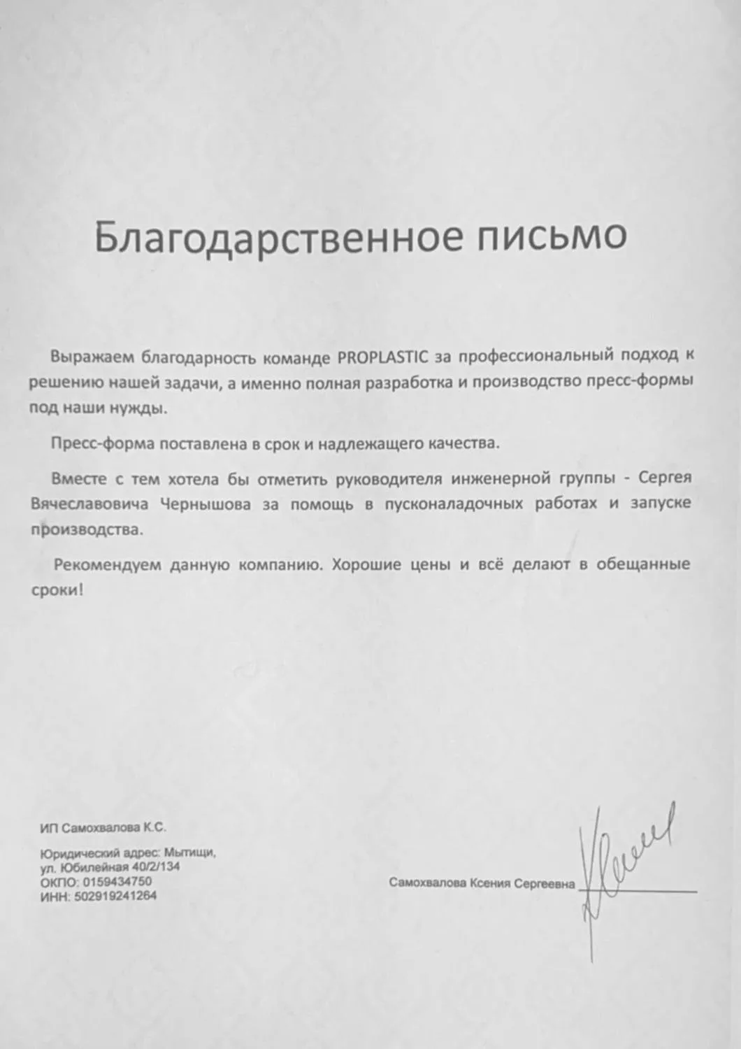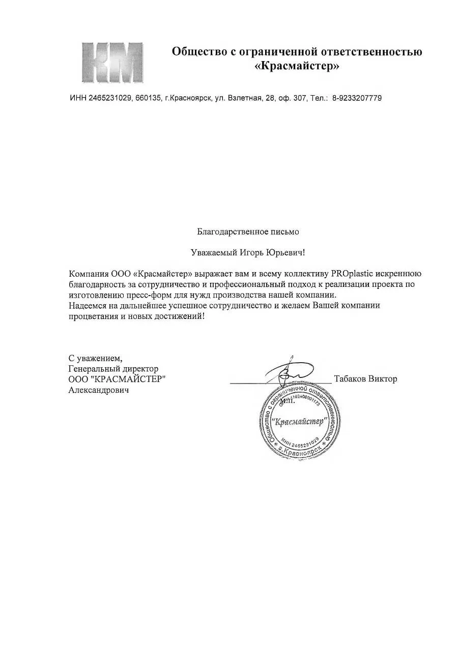 Благодарственное письмо ООО "Красмайстер"