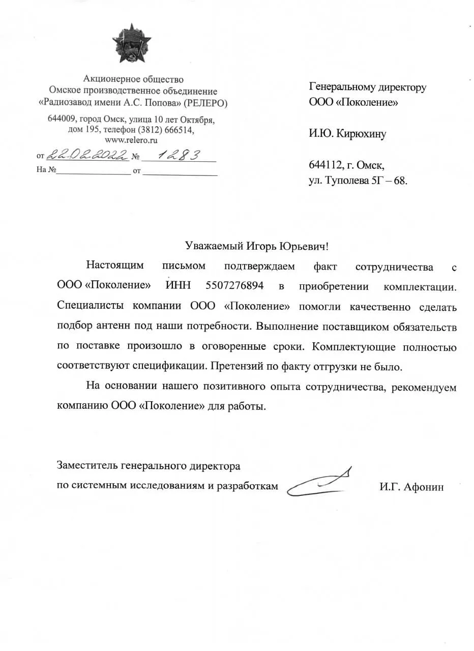 Благодарственное письмо "Радиозавод имени А.С. Попова" (РЕЛЕРО)