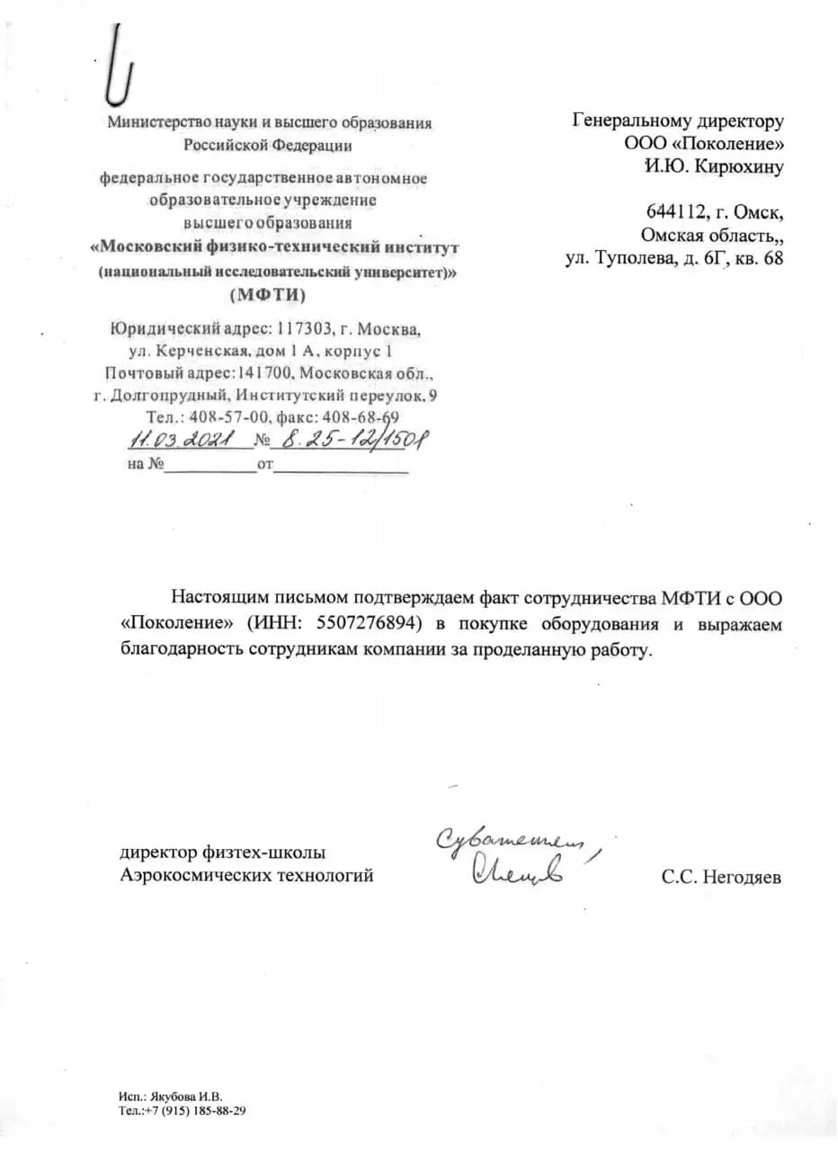 Благодарственное письмо "Московский физико-технический институт (национальный исследовательский университет)" (МФТИ)